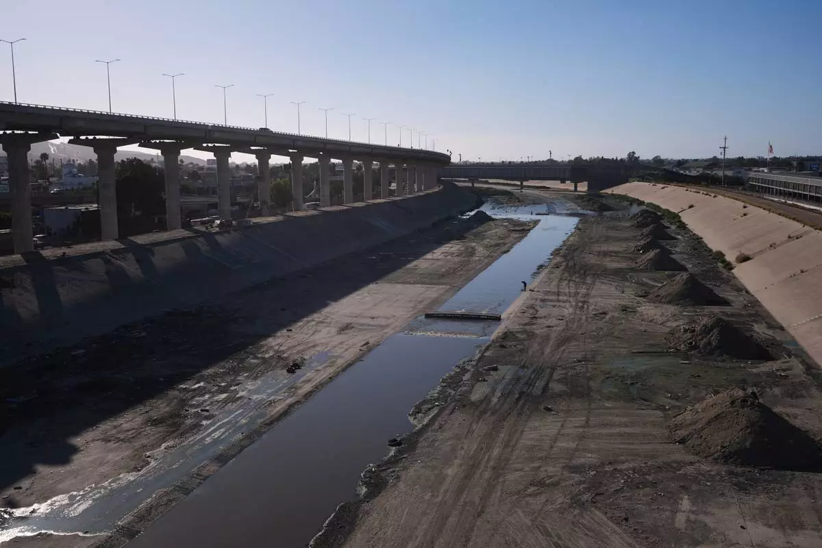 A man walks along the an aqueduct holding the Tijuana River as it arrives to the border and enters the United States, above, from Tijuana, Mexico, Wednesday, April 8, 2026. (AP Photo/Gregory Bull)