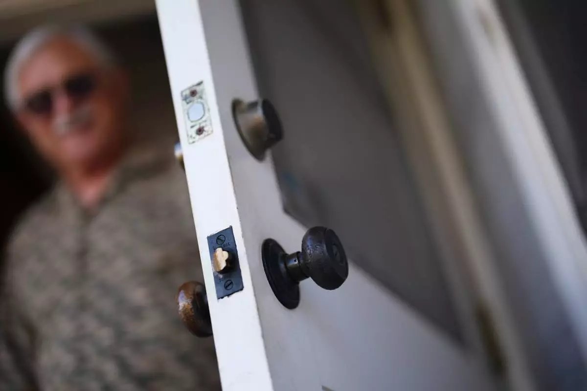 Steve Egger looks out from his door where the outer doorknob has turned black at his home Friday, March 6, 2026, in San Diego. (AP Photo/Gregory Bull)