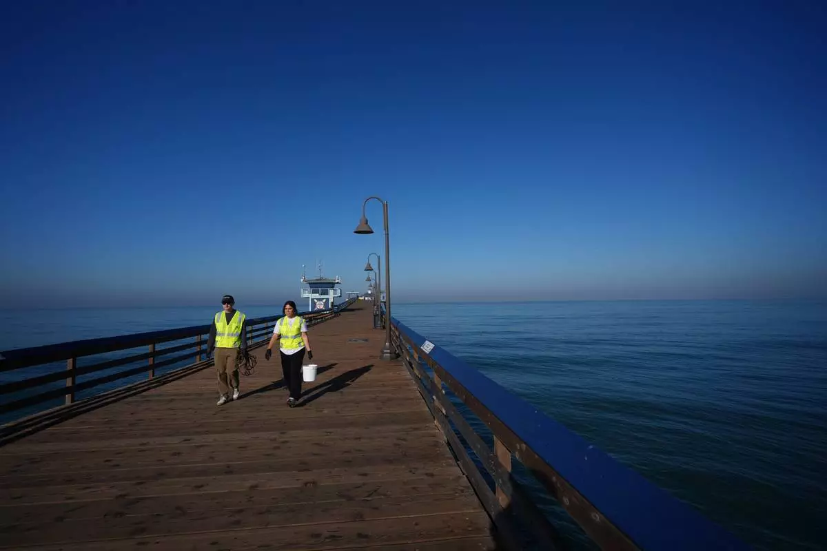 Justin Hamlin, left, and Maddie Tibayan, walk along the Imperial Beach pier after gathering a sample of seawater as part of a research team from the University of California, San Diego, Wednesday, March 11, 2026, in Imperial Beach, Calif. (AP Photo/Gregory Bull)