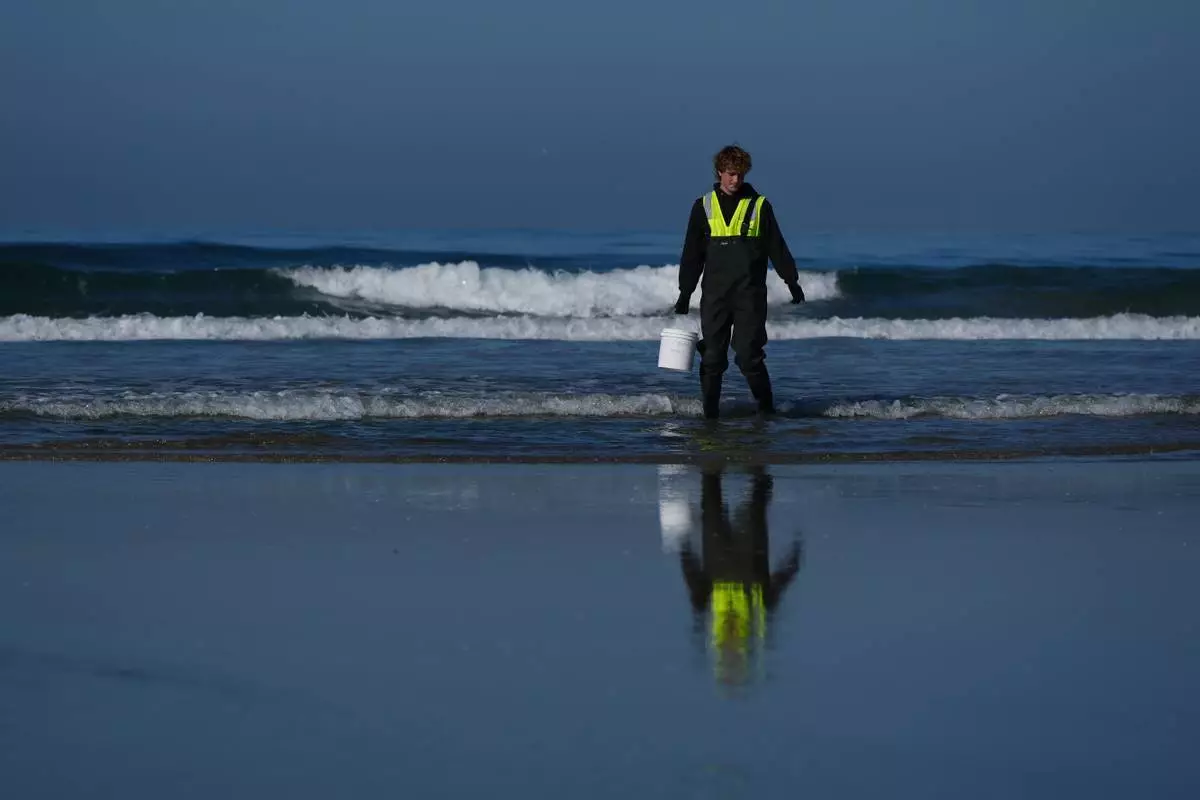 Trent Fry, part of a research team from the University of California, San Diego, takes a sample of seawater Wednesday, March 11, 2026, in Imperial Beach, Calif. (AP Photo/Gregory Bull)