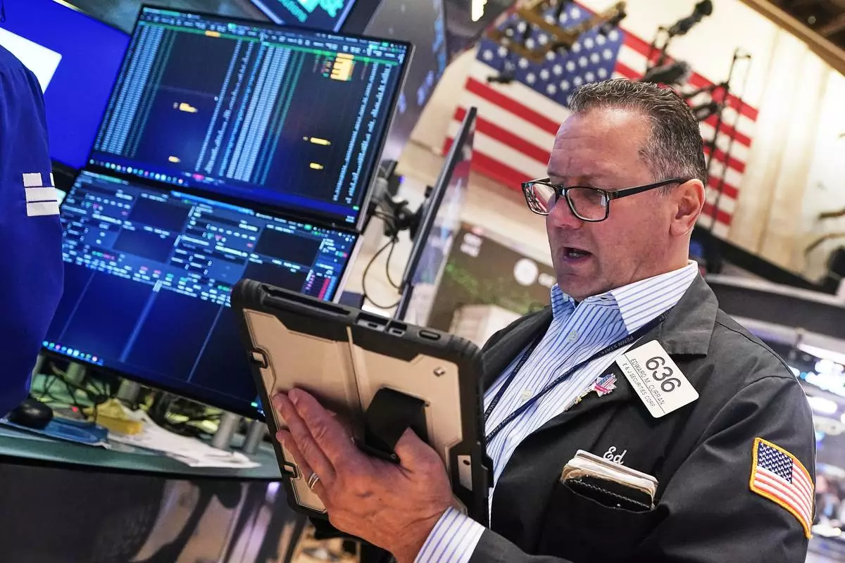 Trader Edward Curran works on the floor of the New York Stock Exchange, Wednesday, April 22, 2026. (AP Photo/Richard Drew)