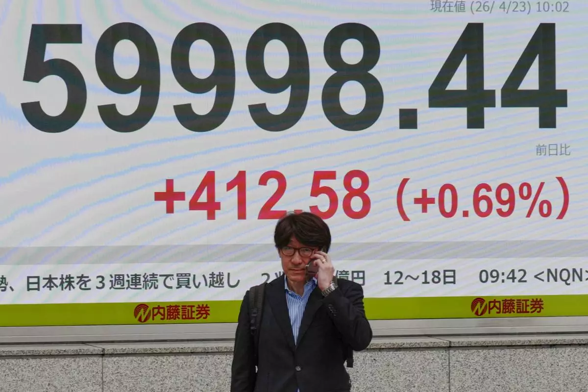 A person walks in front of an electronic stock board showing Japan's Nikkei index at a securities firm Thursday, April 23, 2026, in Tokyo. (AP Photo/Eugene Hoshiko)