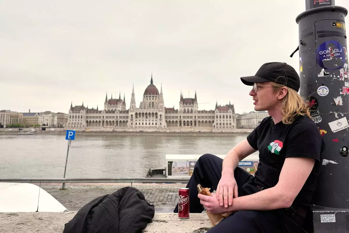 Milan, 26 years-old, relaxes by the Danube river, backdropped by the parliament building in Budapest, Hungary, Monday, April 13, 2026, after Peter Magyar's Tisza party defeated Prime Minister Viktor Orban's Fidesz party in the country's parliamentary elections. (AP Photo/Petr David Josek)