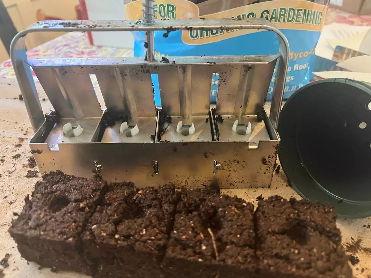 Freshly made soil blocks and a 4-cell, hand-held soil blocker are displayed on Long Island, N. Y., on April 10, 2026. (Jessica Damiano via AP)
