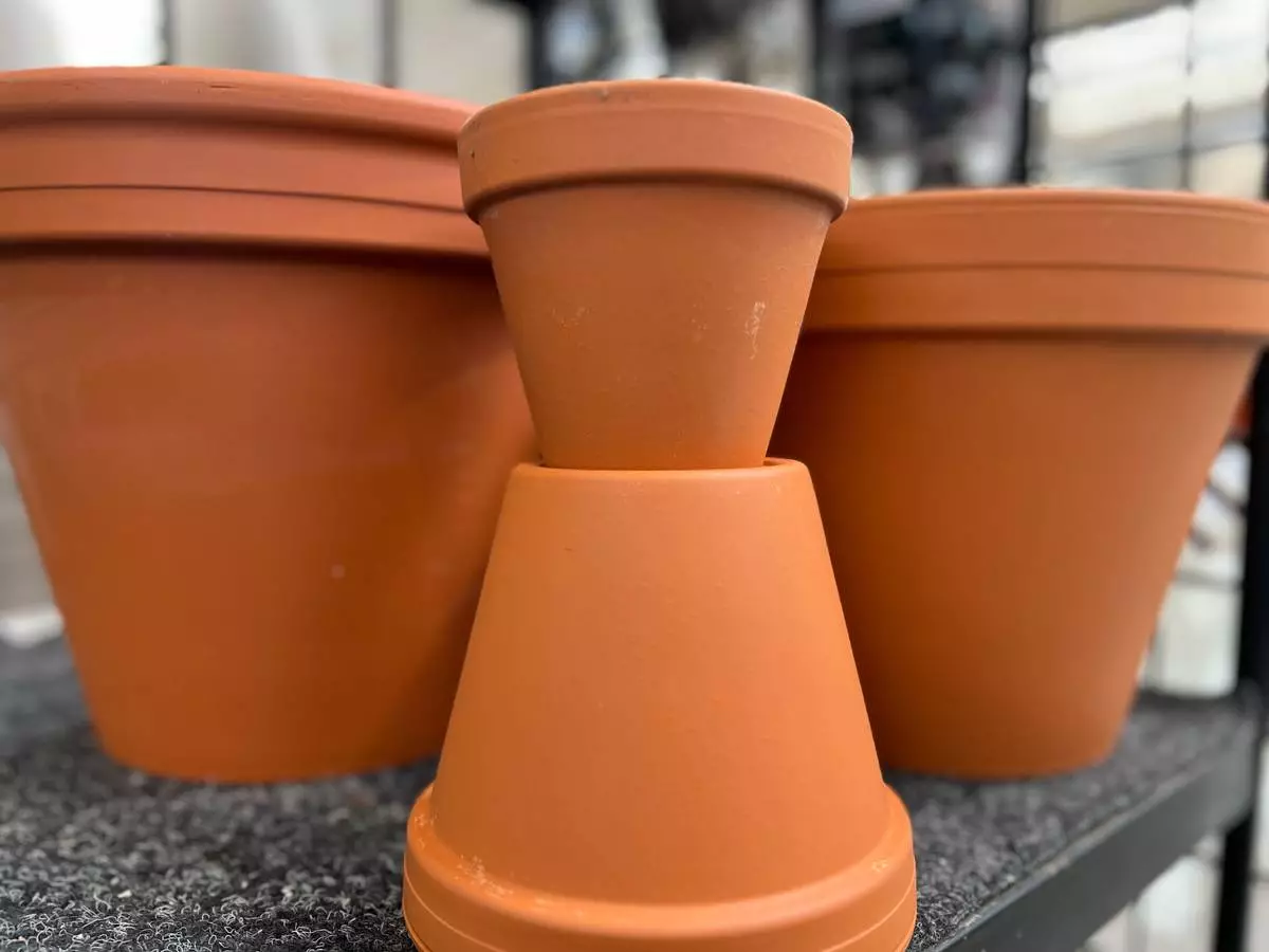 An assortment of plastic-free terracotta planting pots are displayed on Long Island, N. Y., on April 8, 2026. (Jessica Damiano via AP)