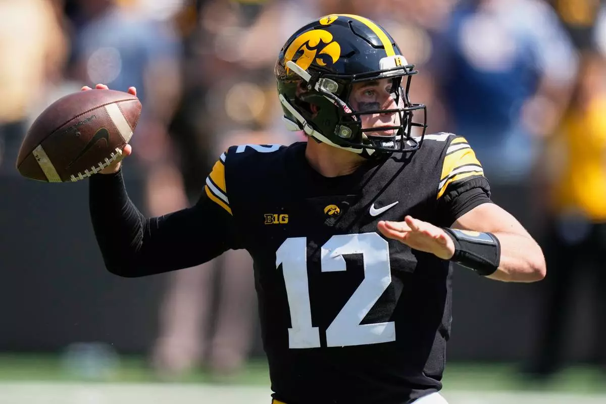 FILE - Iowa quarterback Cade McNamara throws a pass during the second half of an NCAA college football game against Utah State, Sept. 2, 2023, in Iowa City, Iowa. (AP Photo/Charlie Neibergall, File)