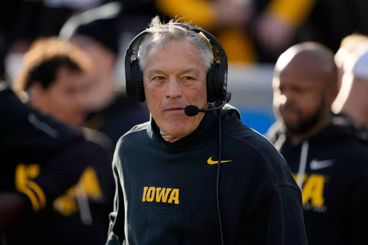 FILE - Iowa head coach Kirk Ferentz stands on the field before an NCAA college football game against Michigan State, Nov. 22, 2025, in Iowa City, Iowa. (AP Photo/Charlie Neibergall, File)