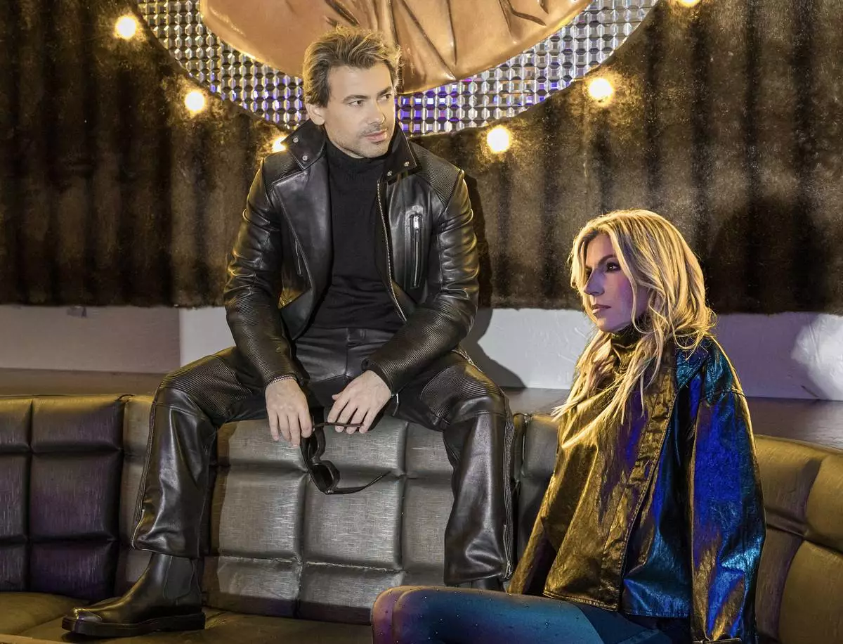 Bastiano Ferrari (left) and Stacy Kemp Ferrari (right) pose together in a glamorous lounge setting. Bastiano wears a black leather jacket and pants while holding sunglasses; Stacy complements the look in a shimmering iridescent black jacket.
