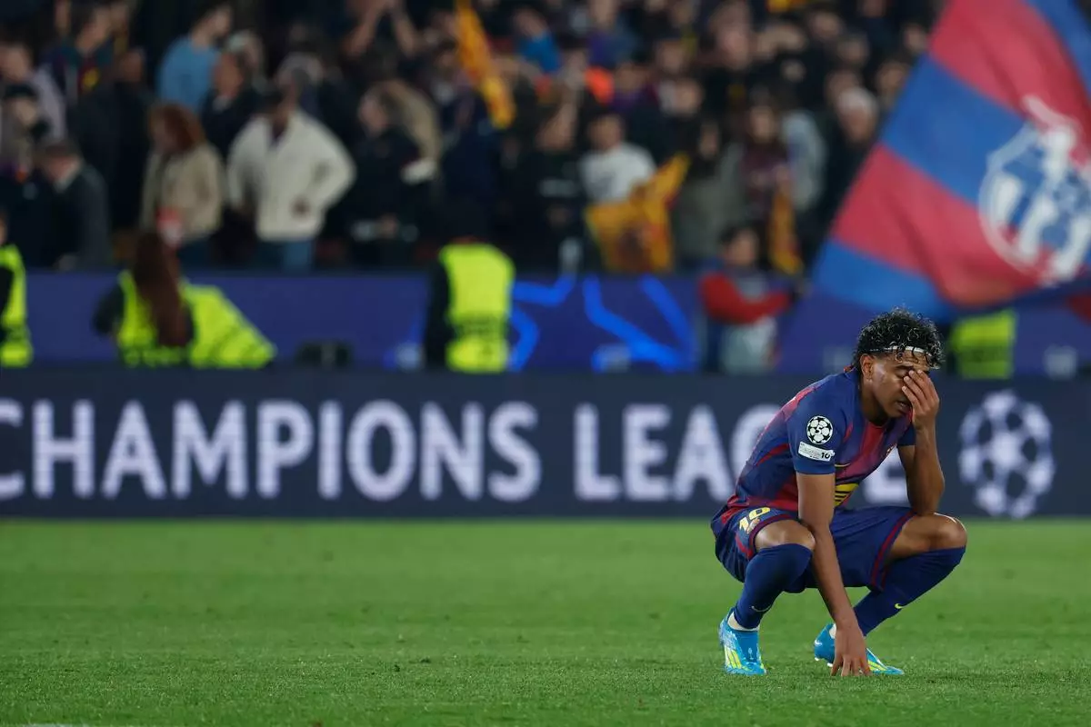 Barcelona's Lamine Yamal reacts disappointed after the Champions League quarterfinal first leg soccer match between Barcelona and Atletico Madrid in Barcelona, Spain, Wednesday, April 8, 2026. (AP Photo/Joan Monfort)