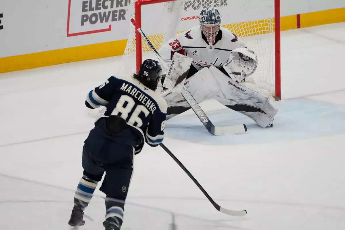 Columbus Blue Jackets right wing Kirill Marchenko (86) skates in on Washington Capitals goaltender Clay Stevenson (33) in the second period of an NHL hockey game Tuesday, April 14, 2026, in Columbus, Ohio. (AP Photo/Sue Ogrocki)