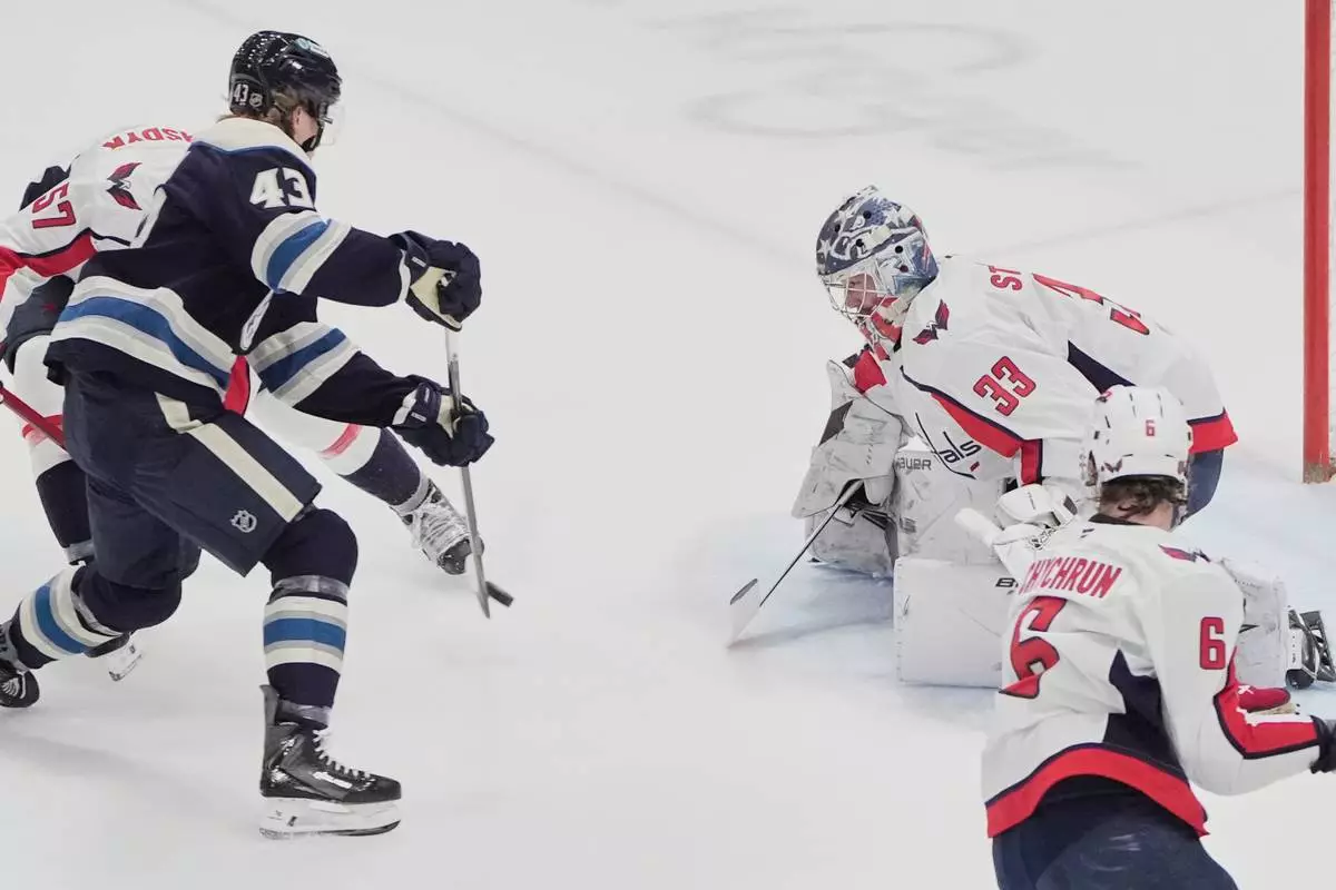 Columbus Blue Jackets left wing Danton Heinen (43) shoots on Washington Capitals goaltender Clay Stevenson (33) in the first period of an NHL hockey game Tuesday, April 14, 2026, in Columbus, Ohio. (AP Photo/Sue Ogrocki)