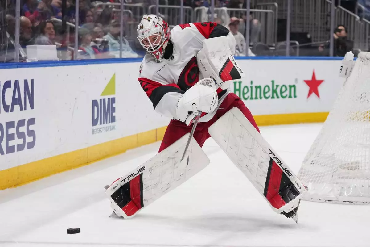 Carolina Hurricanes goaltender Brandon Bussi (32) clears the puck during the second period of an NHL hockey game against the New York Islanders Tuesday, April 14, 2026, in Elmont, N.Y. (AP Photo/Frank Franklin II)
