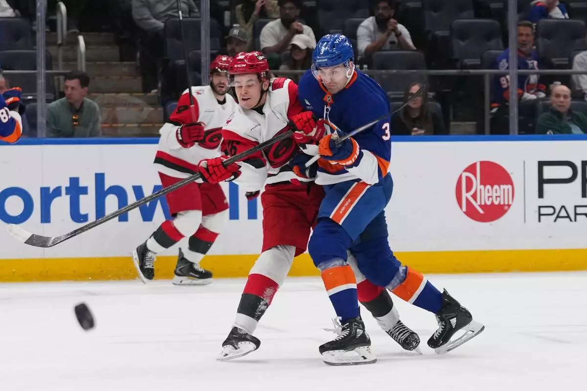New York Islanders' Adam Pelech (3) checks Carolina Hurricanes' Felix Unger Sorum (36) during the first period of an NHL hockey game Tuesday, April 14, 2026, in Elmont, N.Y. (AP Photo/Frank Franklin II)
