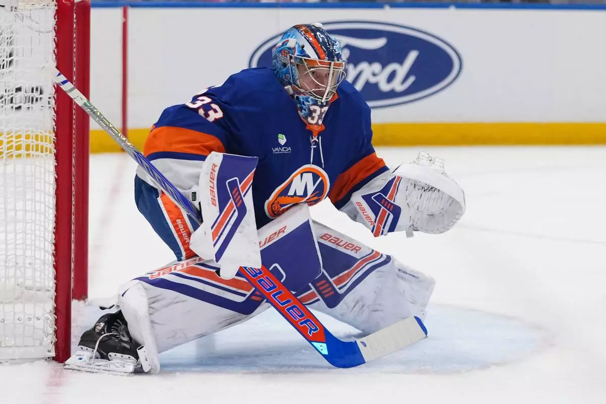 New York Islanders goaltender David Rittich protects the net during the first period of an NHL hockey game against the Carolina Hurricanes Tuesday, April 14, 2026, in Elmont, N.Y. (AP Photo/Frank Franklin II)