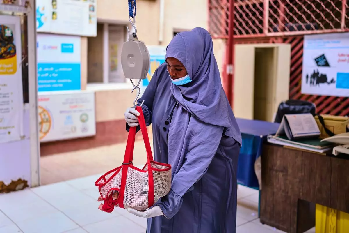A nurse weighs a newly arrived baby patient at the paediatric hospital stabilization center in Port Sudan, Sudan, Wednesday, April 15, 2026. (AP Photo/Bernat Armangue)