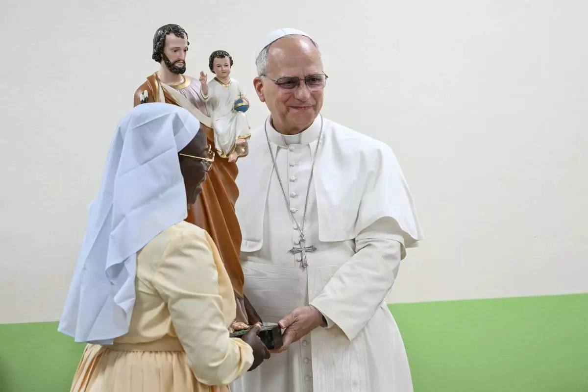 Pope Leo XIV receives a gift during his visit to the Ngul Zamba (Power of God) orphanage in Yaounde, Cameroon, Wednesday April 15, 2026 on the third day of his apostolic journey to Africa. (Alberto Pizzoli, Pool Photo via AP)