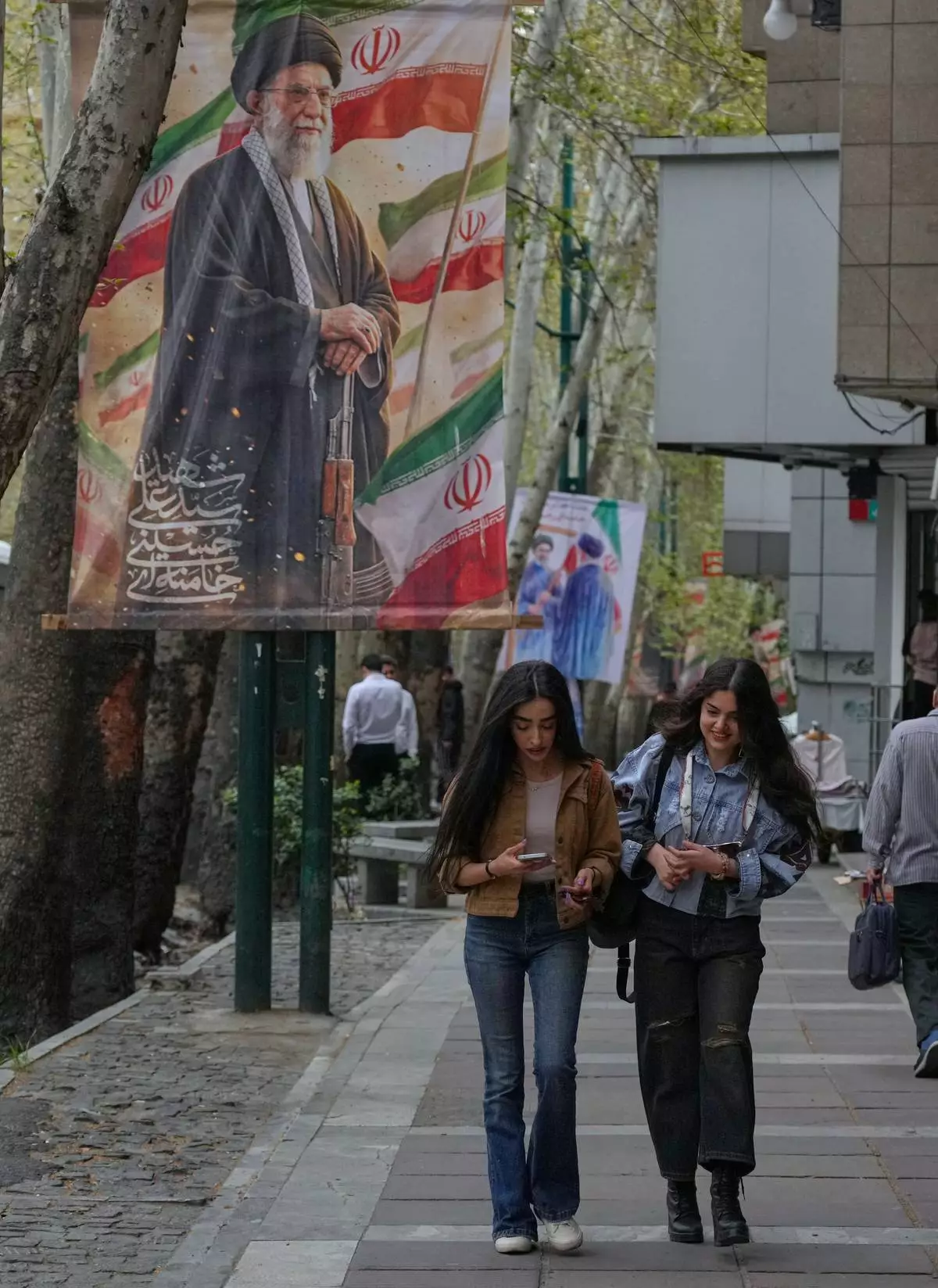 People touch a banner bearing an image of Pope Leo XIV in Luanda, Angola, Monday, April 20, 2026. (AP Photo/Themba Hadebe)