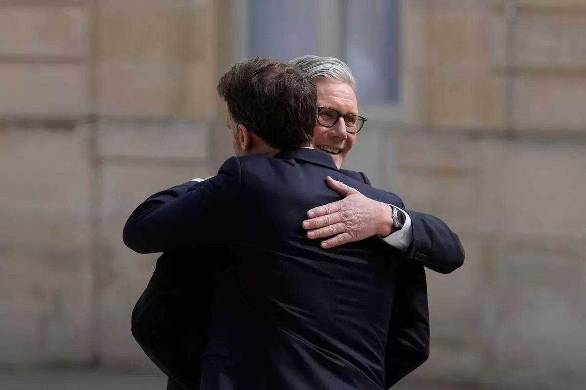France's President Emmanuel Macron, right, welcomes British Prime Minister Keir Starmer prior to an international summit to push forward efforts to reopen the Strait of Hormuz, at the Elysee Palace, in Paris, France, Friday, April 17, 2026. (AP Photo/Michel Euler)