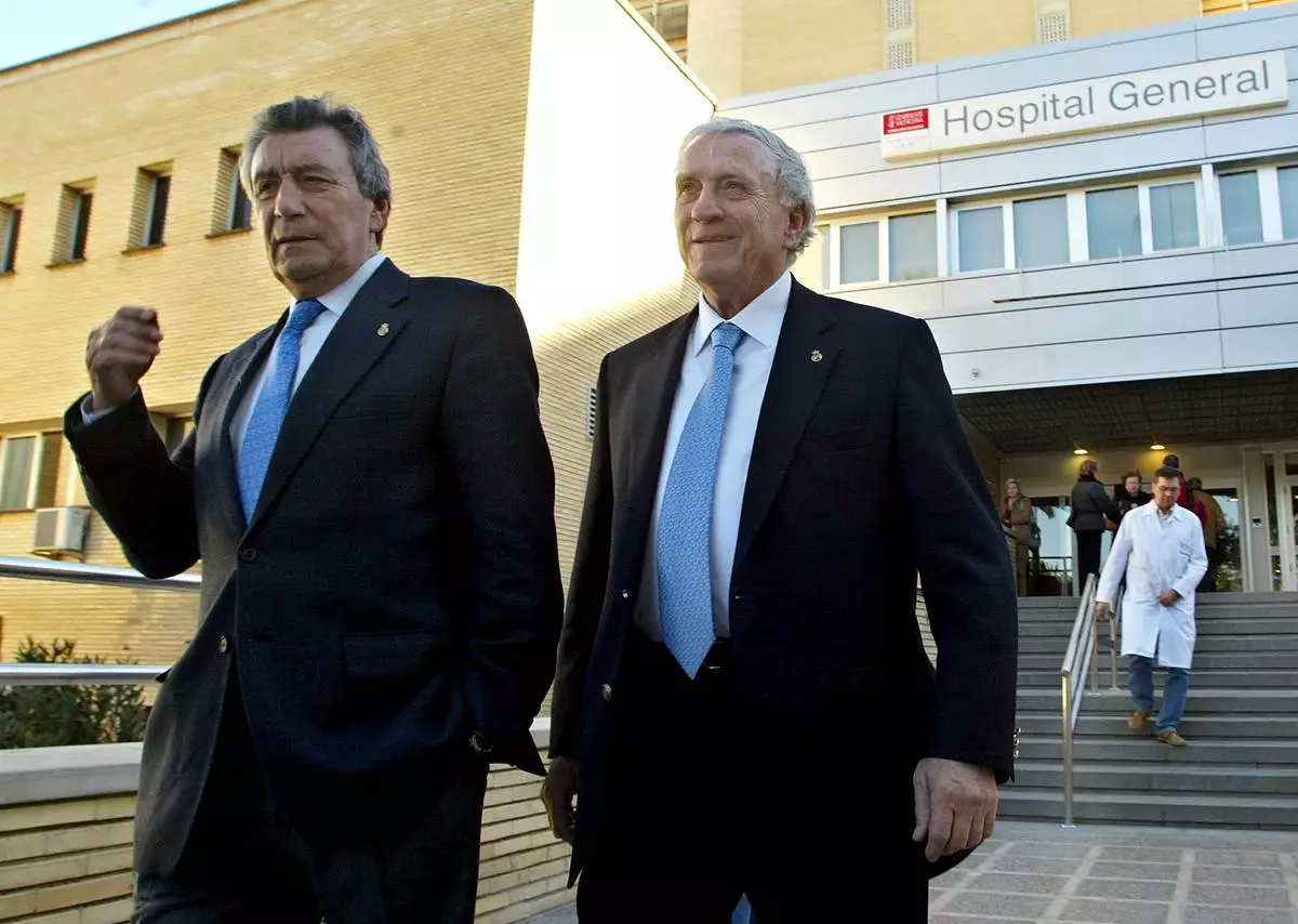 FILE -Former Real Madrid soccer players Enrique Perez "Pachin", left, and Jose Emilio Santamaria leave La Fe hospital in Valencia, Spain, Dec. 27, 2005 after visiting their former teammate Alfredo di Stefano, of Argentina. (AP Photo/Fernando Bustamante, File)