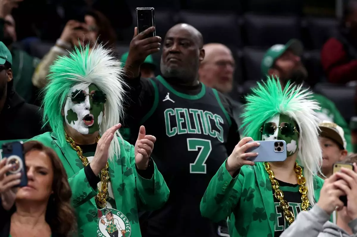 Boston Celtics fans react as the team is announced before an NBA basketball game against the Orlando Magic, Sunday, April 12, 2026, in Boston. (AP Photo/Mark Stockwell)
