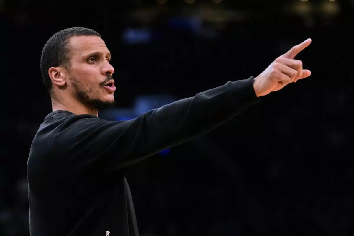 Boston Celtics head coach Joe Mazzulla calls to his players during the first half of an NBA basketball game against the New Orleans Pelicans, Friday, April 10, 2026, in Boston. (AP Photo/Charles Krupa)