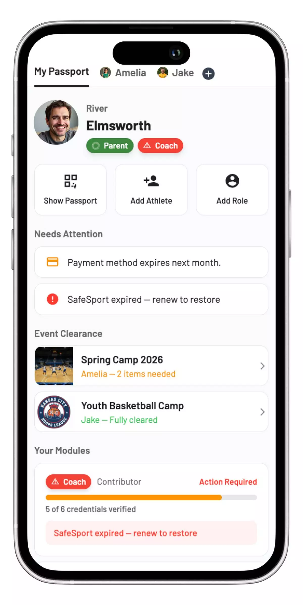 The athlete universal waiver within the passport allows participants to complete paperwork once.
