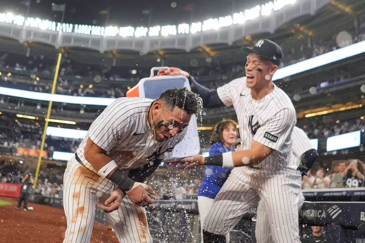 New York Yankees' Aaron Judge, right, celebrates with José Caballero after Caballero had a walk-off two run hit during the ninth inning of a baseball game against the Los Angeles Angels Wednesday, April 15, 2026, in New York. (AP Photo/Frank Franklin II)