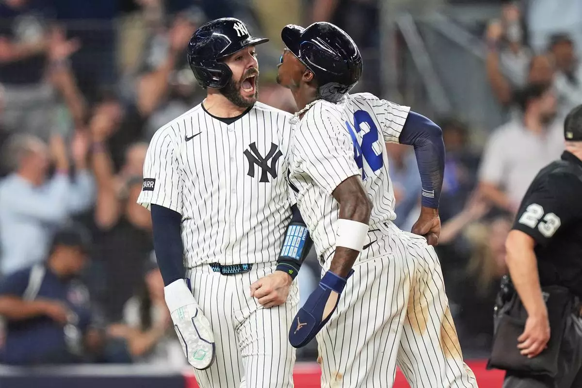 New York Yankees' Austin Wells, left, celebrates with Jazz Chisholm Jr. after they scored on a walk-off two run hit during the ninth inning of a baseball game against the Los Angeles Angels Wednesday, April 15, 2026, in New York. (AP Photo/Frank Franklin II)