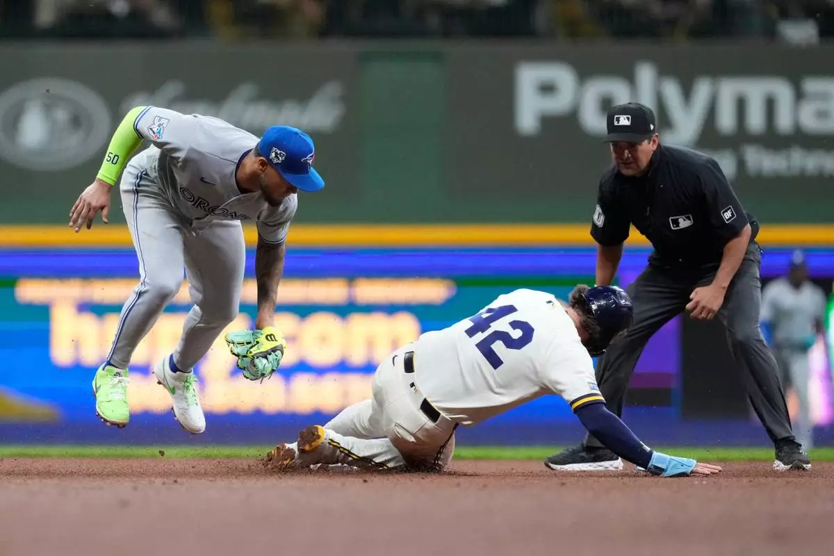 Toronto Blue Jays' Lenyn Sosa, left, tags out Milwaukee Brewers' Brice Turang at second base during the sixth inning of a baseball game Wednesday, April 15, 2026, in Milwaukee. (AP Photo/Aaron Gash)