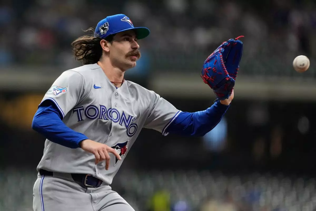Toronto Blue Jays' Dylan Cease catches the ball at first base to force an out during the second inning of a baseball game against the Milwaukee Brewers, Wednesday, April 15, 2026, in Milwaukee. (AP Photo/Aaron Gash)