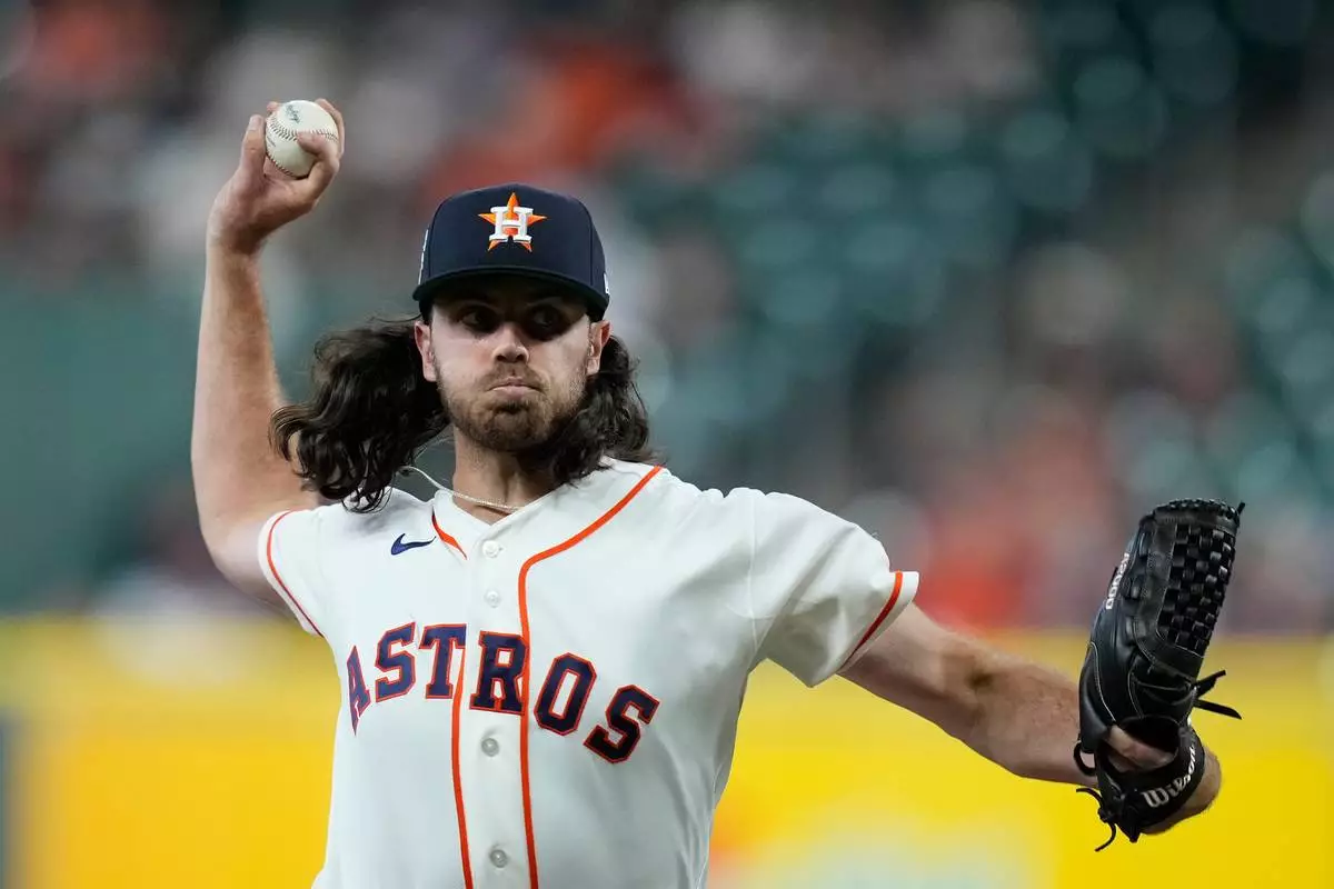 Houston Astros pitcher Spencer Arrighetti delivers during the first inning of a baseball game against the Colorado Rockies, Wednesday, April 15, 2026, in Houston. (AP Photo/Kevin M. Cox)