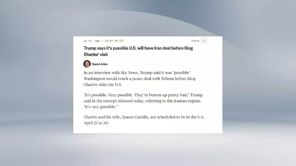 U.S. President Donald Trump said on Wednesday that it is "very possible" the United States would reach a peace deal with Iran before the UK's King Charles III visits the country in late April, according to an NBC report.