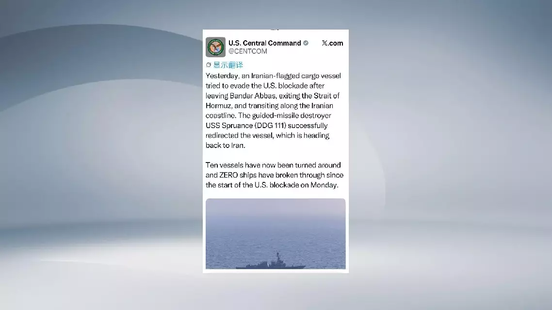 In a post on the social media platform X, the command said the incident occurred on Tuesday, when an Iranian-flagged cargo vessel "tried to evade the U.S. blockade after leaving Bandar Abbas, exiting the Strait of Hormuz, and transiting along the Iranian coastline."