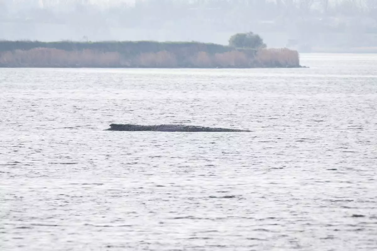 A humpback whale is stuck off near the island of Poel, Weitendorf-Hof, Germany, Thursday, April 16, 2026. (Philip Dulian/dpa via AP)