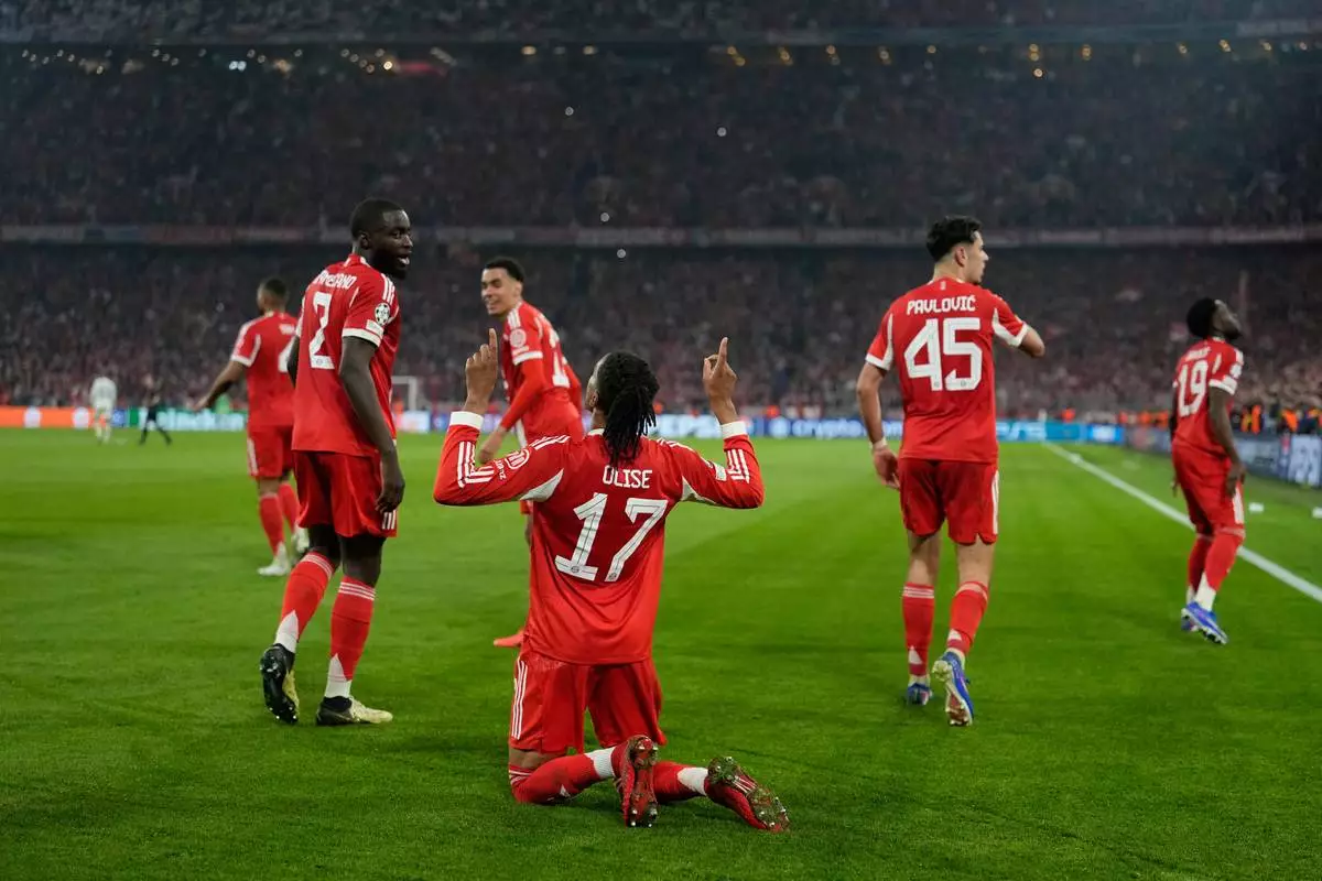 dBayern's Michael Olise celebrates with his teammates after scoring his side's fourth goal uring the Champions League quarterfinal second leg soccer match between Bayern Munich and Real Madrid in Munich, Germany, Wednesday, April 15, 2026. (AP Photo/Matthias Schrader)