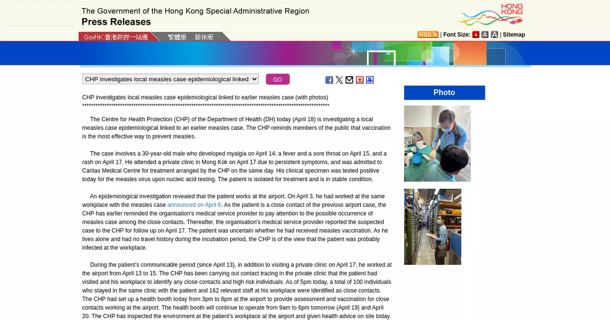 The Centre for Health Protection (CHP) of the Department of Health (DH) today (April 20) is investigating a local measles case epidemiologically linked to earlier measles cases. In response to the global rise in measles cases and the recent consecutive infections of three individuals working at the airport, the CHP once again urged airport staff and foreign domestic helpers to receive the measles vaccine to protect their health and prevent the virus from spreading in the community.