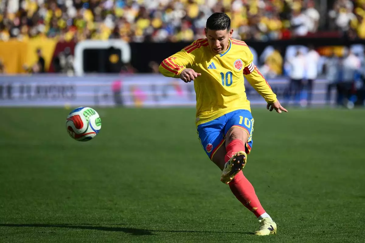FILE - Colombia midfielder James Rodríguez (10) in action during the second half of an international friendly soccer match against France, Sunday, March 29, 2026, in Landover, Md. (AP Photo/Nick Wass)
