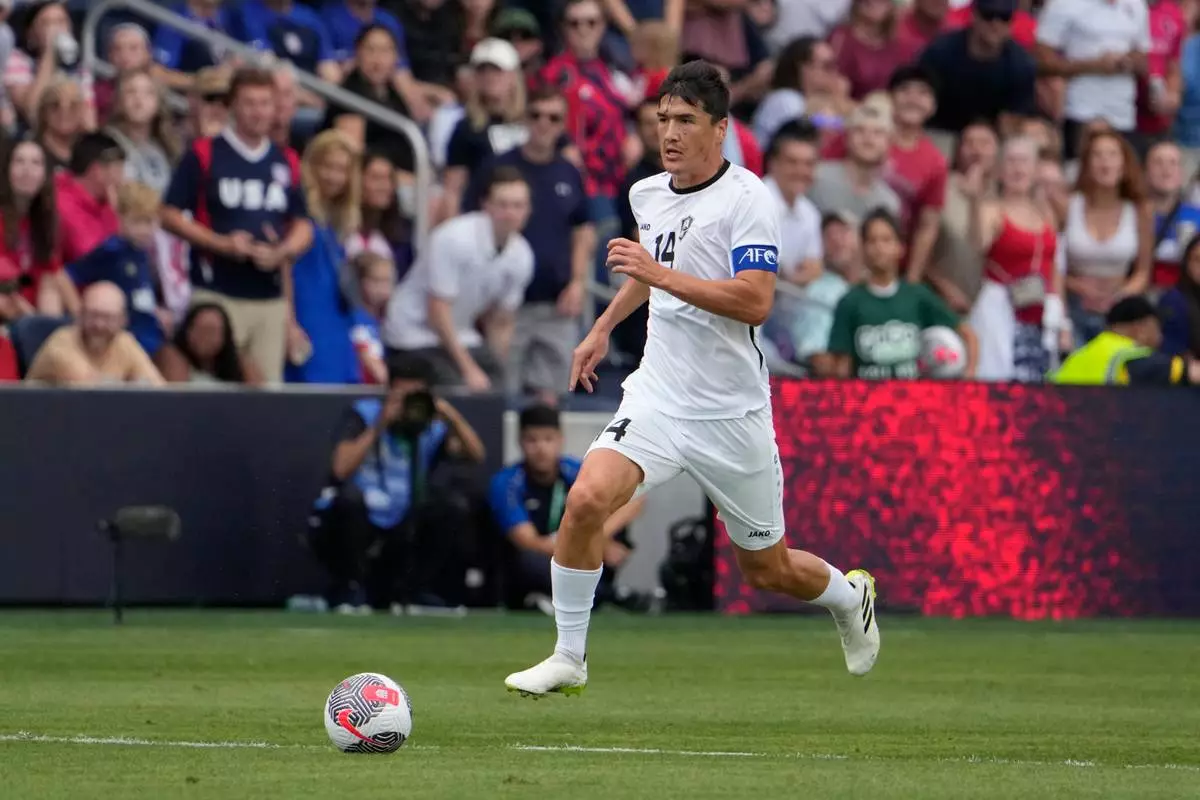 FILE - Uzbekistan's Eldor Shomurodov (14) brings the ball down the pitch during the first half of an international friendly soccer match against the United States Saturday, Sept. 9, 2023, in St. Louis. (AP Photo/Jeff Roberson, File)