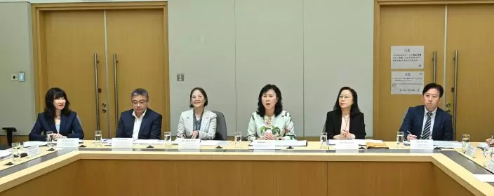 The Working Group on Public Transport Service Special Applications, led by the Secretary for Transport and Logistics, Ms Mable Chan (third right), convened the first meeting today (April 16). The Under Secretary for Environment and Ecology, Miss Diane Wong (third left); the Commissioner for Transport, Miss Winnie Tse (second right); and the Government Economist, Ms Irina Fan (first left), also attended the meeting. Source: HKSAR Government Press Releases