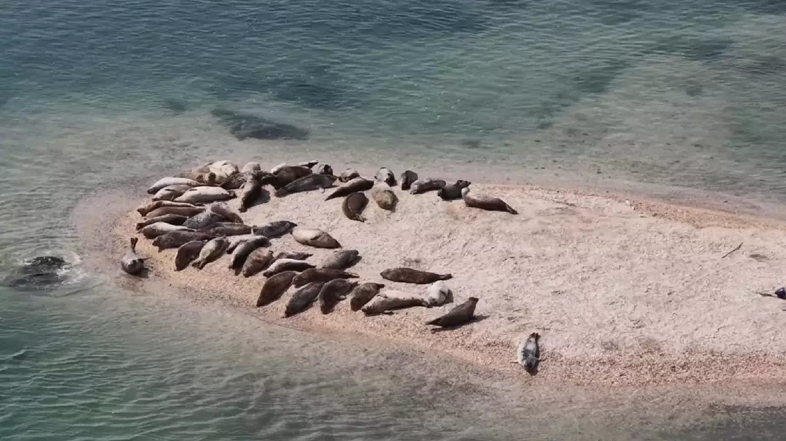 During the patrols, researchers captured footage of large groups of spotted seals basking in the sun on a sandbank several times using drone camera without disturbing them.