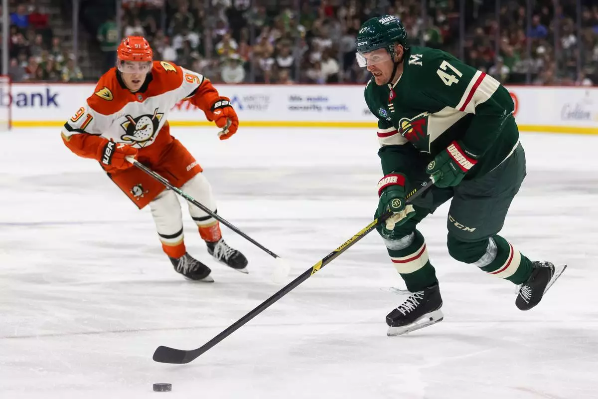Minnesota Wild's Michael McCarron (47) controls the puck ahead of Anaheim Ducks' Leo Carlsson (91) during the third period of an NHL hockey game Tuesday, April 14, 2026, in St. Paul, Minn. (AP Photo/Lily Dozier)