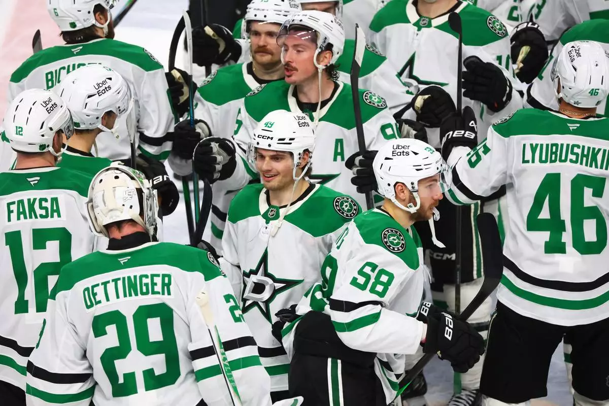 Dallas Stars teammates celebrate victory following a shootout of an NHL hockey game against the Buffalo Sabres Wednesday, April 15, 2026, in Buffalo, N.Y. (AP Photo/Jeffrey T. Barnes)