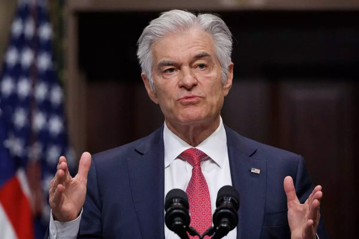 FILE - Administrator for the Centers for Medicare & Medicaid Services Dr. Mehmet Oz speaks during a news conference on efforts to combat fraud, in the Old Eisenhower Executive Office Building on the White House campus Feb. 25, 2026, in Washington. (AP Photo/Tom Brenner, File)