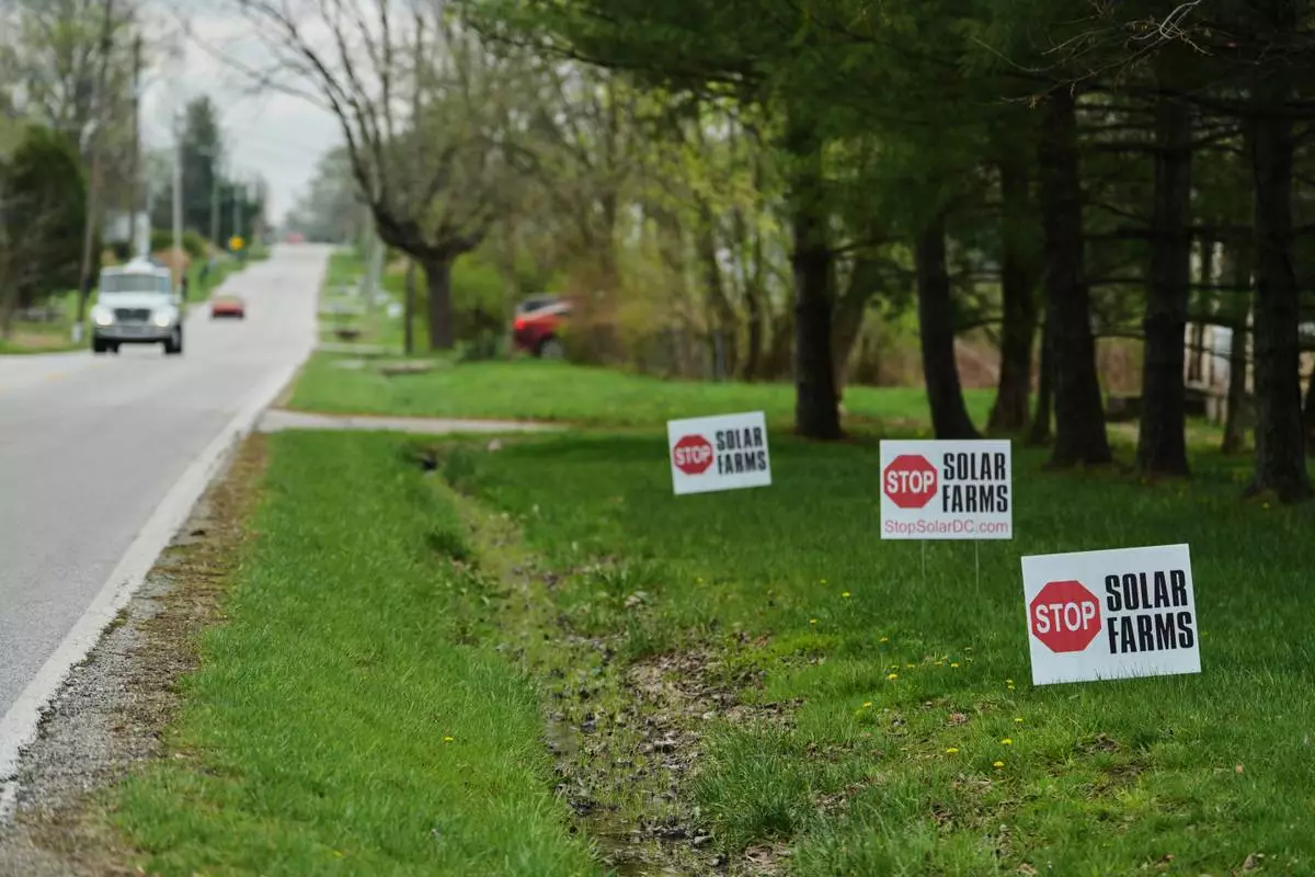 Signs opposing solar development sit near a road Friday, April 3, 2026, in Manchester, Ind. (AP Photo/Joshua A. Bickel)