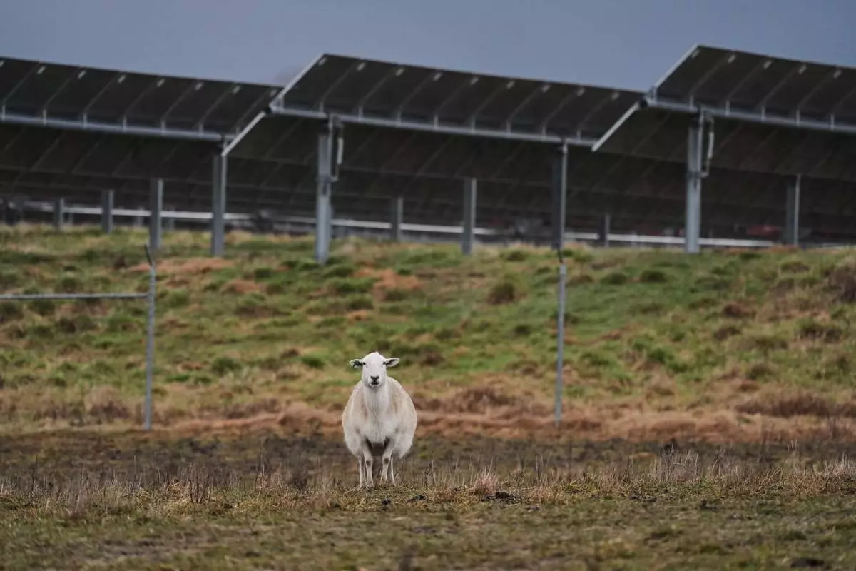 A sheep stands in front of solar panels on a farm Wednesday, Jan. 14, 2026, in Lancaster, Ky. (AP Photo/Joshua A. Bickel)