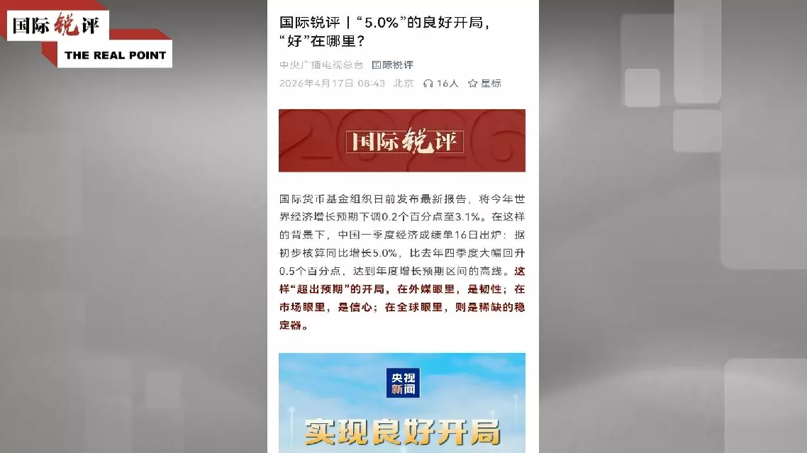 China's economy grew 5 percent in the first quarter of 2026, signaling a solid start to the 15th Five-Year Plan (2026-2030) and reinforcing the country's role as a stabilizing force in an increasingly volatile global economy, says a China Media Group commentary published on Friday.