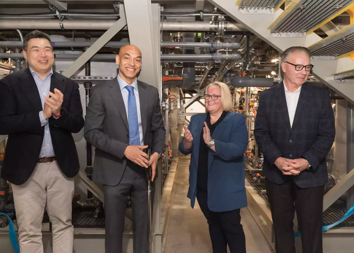 Mangrove's electrochemical lithium refining facility ribbon cutting ceremony in Delta, B.C. Pictured from L to R: InBC Chief Investment Officer Thomas Park, Mangrove Lithium CEO Saad Dara, Delta MP Jill McKnight, and Delta Mayor, George V. Harvie. Photo by Avrinder Dhillon/Mangrove Lithium