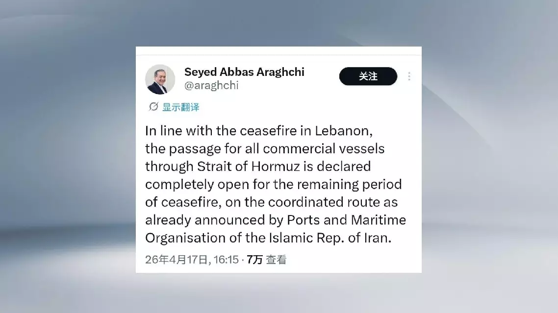 Iranian Foreign Minister Seyed Abbas Araghchi said in a post on social media platform X on Friday that in line with the ceasefire in Lebanon, the passage for all commercial vessels through the Strait of Hormuz is declared "completely open" for the remaining period of the ceasefire.