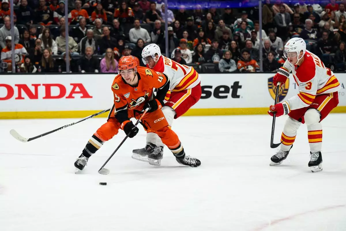 Anaheim Ducks right wing Beckett Sennecke (45) tries to keep control of the puck while under pressure from Calgary Flames center Martin Pospisil, center, during the first period of an NHL hockey game Saturday, April 4, 2026, in Anaheim, Calif. (AP Photo/William Liang)