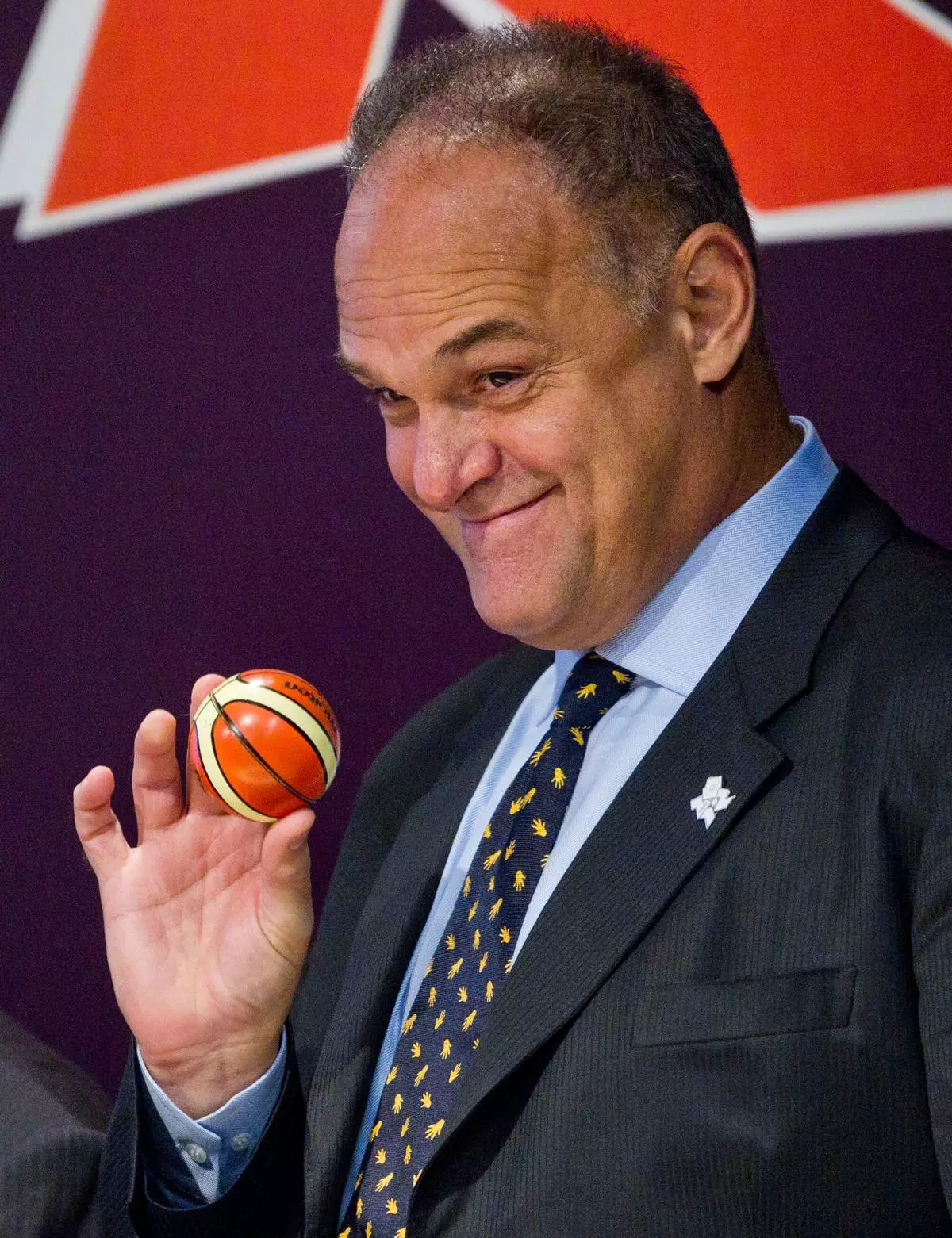 FILE - Brazil's former basketball player Oscar Schmidt shows a miniature basketball containing the name of a country during the draw for the London 2012 Olympic men's basketball tournament in Rio de Janeiro, April 30, 2012. Schmidt, whom his Brazil compatriots know as the “Holy Hand,” died. Friday, April 17, 2026. He was 68. (AP Photo/Victor R. Caivano, File)